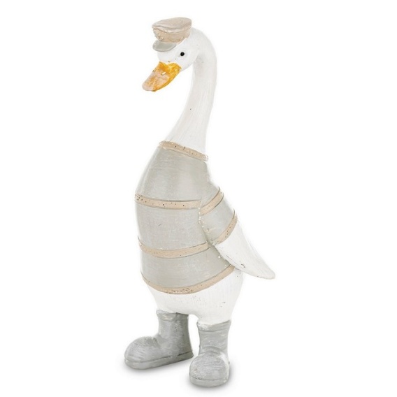 Figurka gęsi, wykonana z wysokiej jakości tworzywa sztucznego. Ta pani gęś wyraźnie ma plan na dzień - czapeczka na głowie, sweterek z paskami, kalosze gotowe na każdą pogodę. Biało-beżowa kolorystyka z szarymi akcentami nadaje jej spokojnego, wiosennego wyglądu.